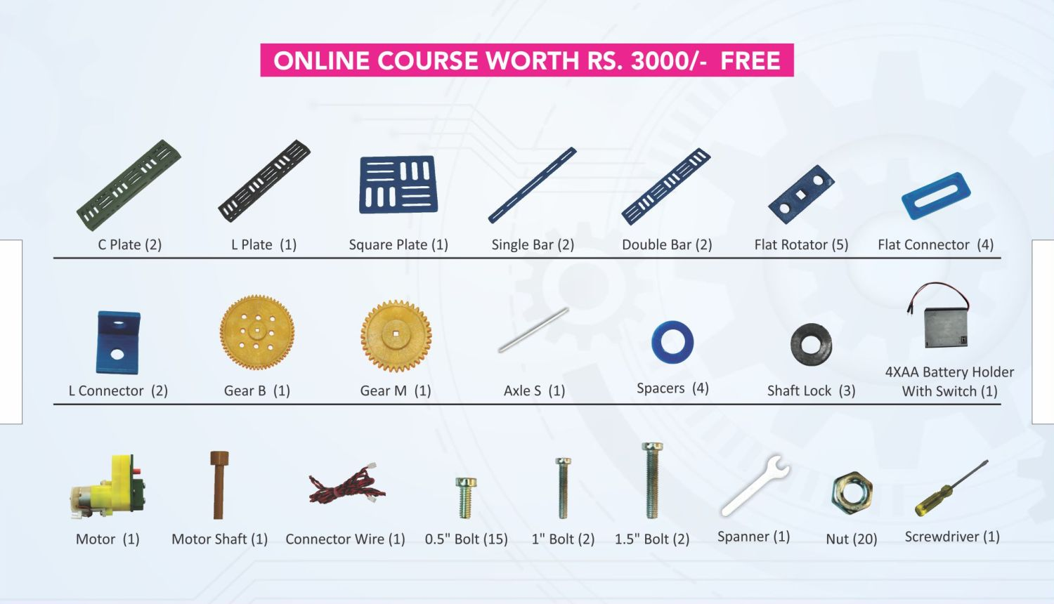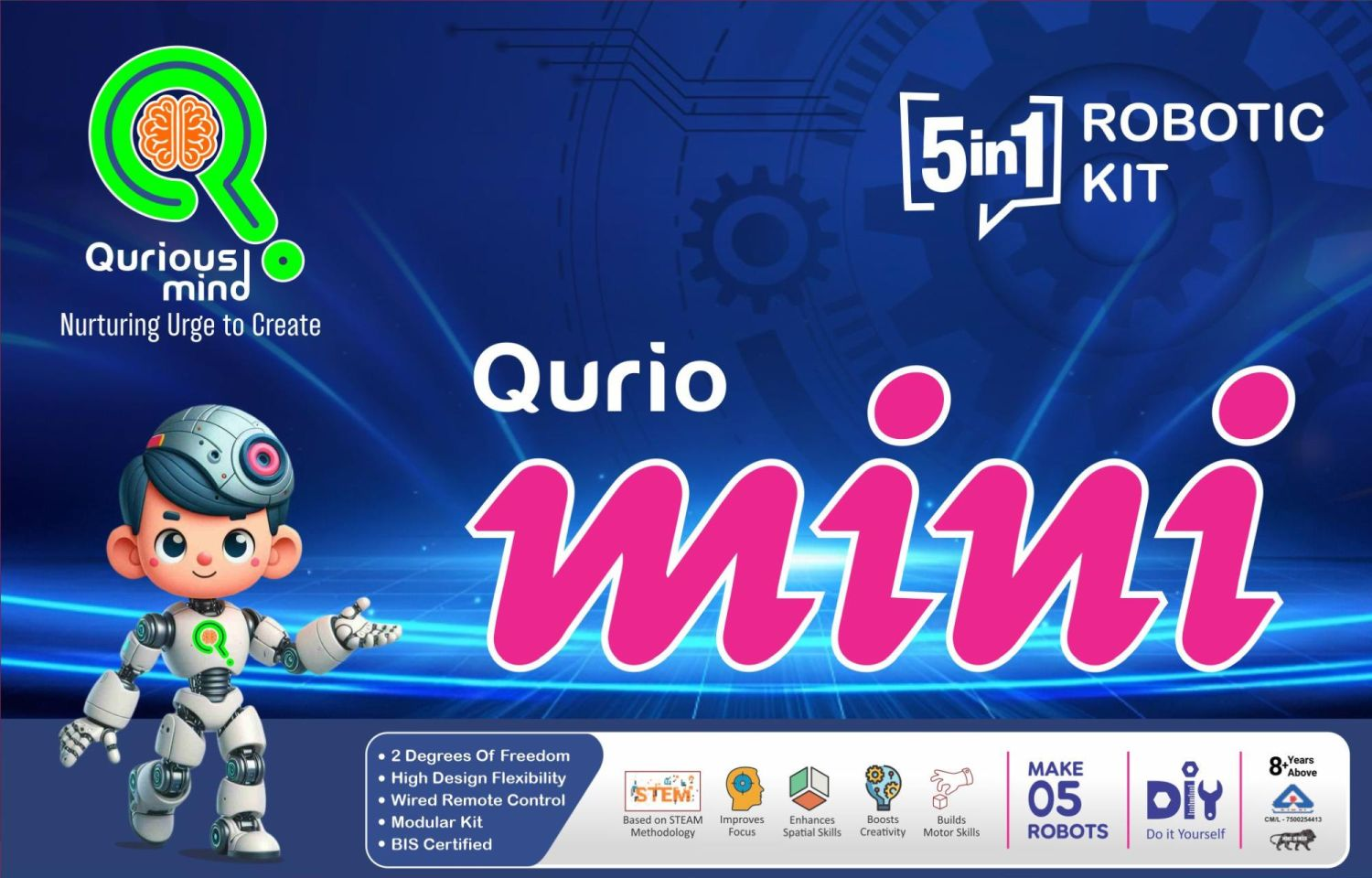 Qurio Mini is a beginner-friendly modular robotic kit designed to introduce children to the world of robotics. It features a single motor, a battery holder with switch and made of durable plastic structural parts, including two gear sizes to explore basic concepts of speed and torque.